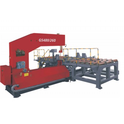 立式横切滑轮式金属带锯床(G5480/260) 立式横切滑轮式金属带锯床(G5480/260)保修单 :1 年机械保修标准设备:1. 刀片清洁刷2.工作灯3.双金属锯片1片4.一套工具带工具箱5.激光投影仪6.自动排屑器7.液压刀片张紧和导臂运动产品描述:● 本机主要用于切割硬度小于HRC35的大型黑色金属、中型铸件、锻件、钢坯和板坯。产品特点:● G54系列砌块立锯机采用工件“T”型布局,锯切线。锯切时,锯片扭转90度,锯弓沿导轨纵向切割工件;● 采用液压、机电控制,性能稳定;● 主传