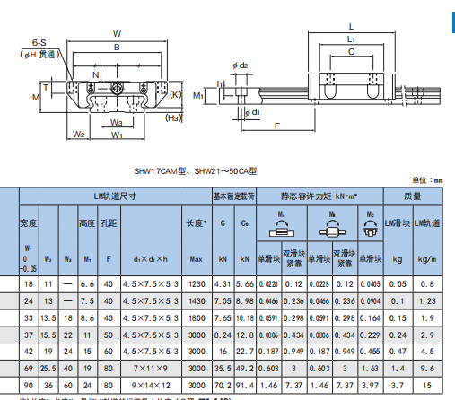 SHW型的LM轨道宽度较大并采用低重心结构,非常适合于安装在要求节省空间的场所,以及在要求MC力矩刚性的情况下单轴使用。
