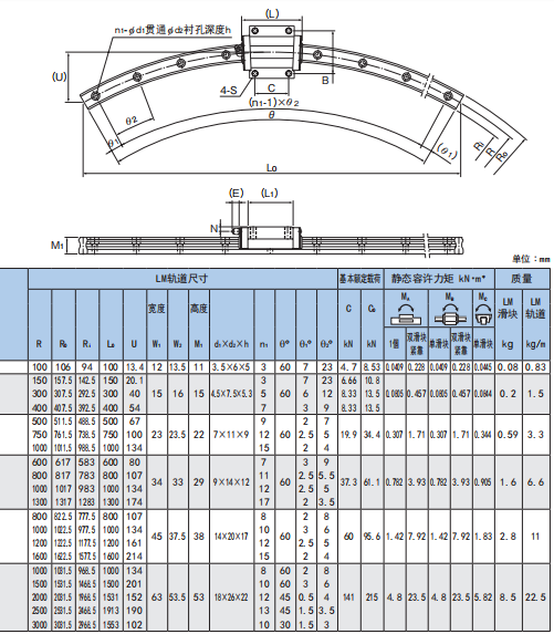 【结构与特长】钢球沿着LM轨道和LM滑块上经过精密研磨加工的4列滚动面进行滚动;通过组装在LM滑块上的端盖板,使钢球列循环运动。可实现高精度圆弧运动的R形圆弧滚动导轨采用已有丰富实际业绩的4方向等负荷型LM滚动导轨HSR型作为其基本结构,是运用崭新的构思开发而成的产品。