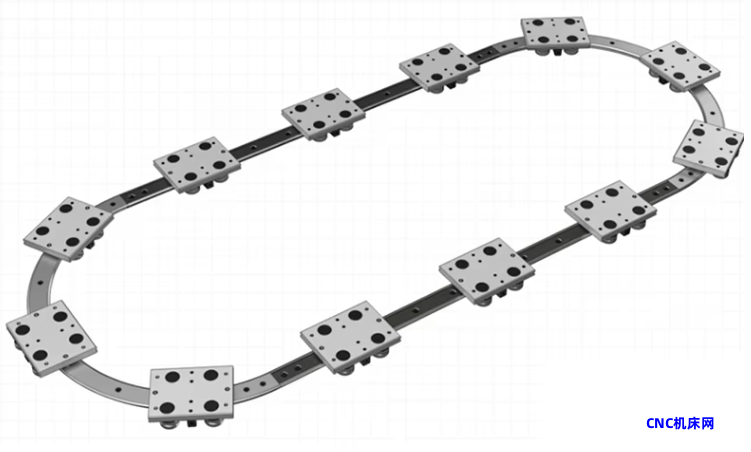 直曲滚动导轨HMG型是将直线LM滚动导轨HSR型和曲线R形圆弧滚动导轨HCR型的各项技术融合在一起而开发出来的用1种LM滑块即可实现直线部和曲线部的连续行走的新型直曲滚动导轨。这种导轨可以提高装配、输送生产线、检查装置等领域的作业效率,并且可以通过结构的简化(如减少升降机、转台等)大幅度地降低成本。