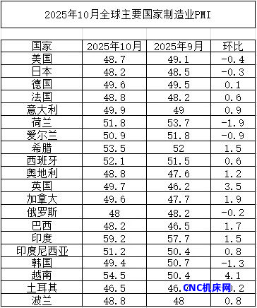 2025年10月份,欧洲制造业PMI为49.6%,较上月上升0.6个百分点。从主要国家来看,德国、英国、法国和意大利制造业PMI较上月均有小幅上升,但指数均在50%以下;西班牙和希腊制造业PMI较上月有不同程度上升,指数均在50%以上。