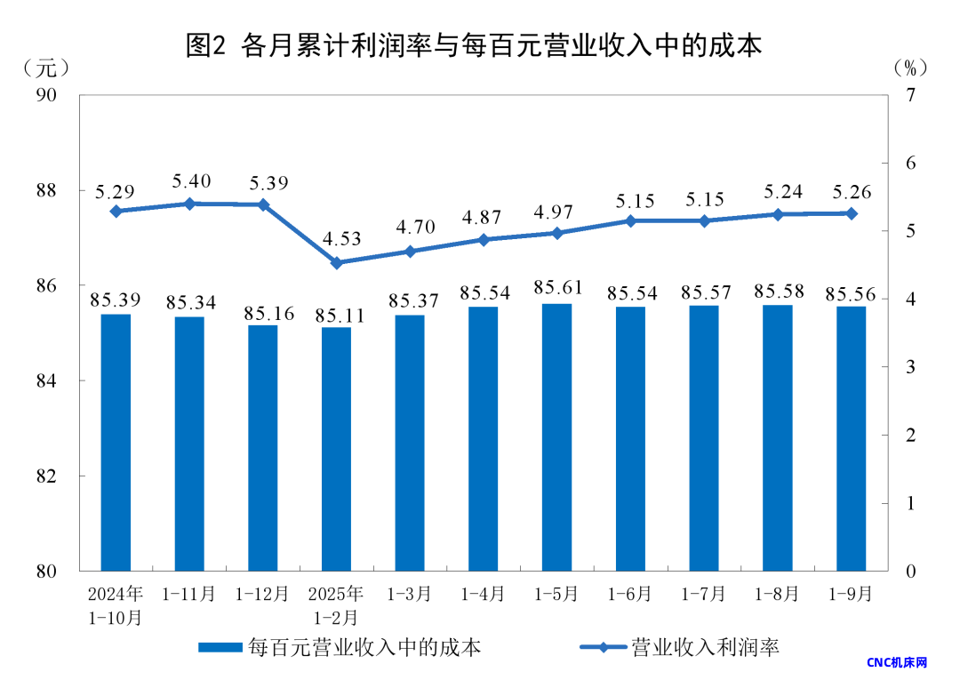 1—9月份,规模以上工业企业每百元营业收入中的成本为85.56元,同比增加0.18元;每百元营业收入中的费用为8.36元,同比减少0.16元。