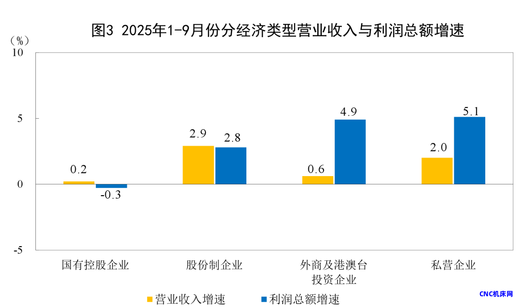 1—9月份,规模以上工业企业中,国有控股企业实现利润总额17021.8亿元,同比下降0.3%;股份制企业实现利润总额39923.5亿元,增长2.8%;外商及港澳台投资企业实现利润总额13509.7亿元,增长4.9%;私营企业实现利润总额15131.7亿元,增长5.1%。