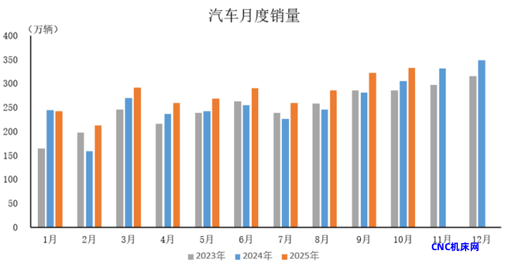 2025年10月,汽车产销分别完成335.9万辆和332.2万辆,环比分别增长2.5%和3%,同比分别增长12.1%和8.8%。