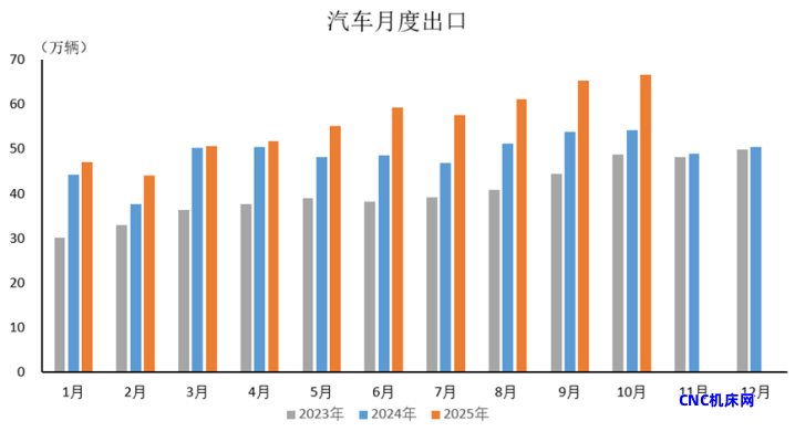 2025年10月,汽车出口66.6万辆,环比增长2.1%,同比增长22.9%。