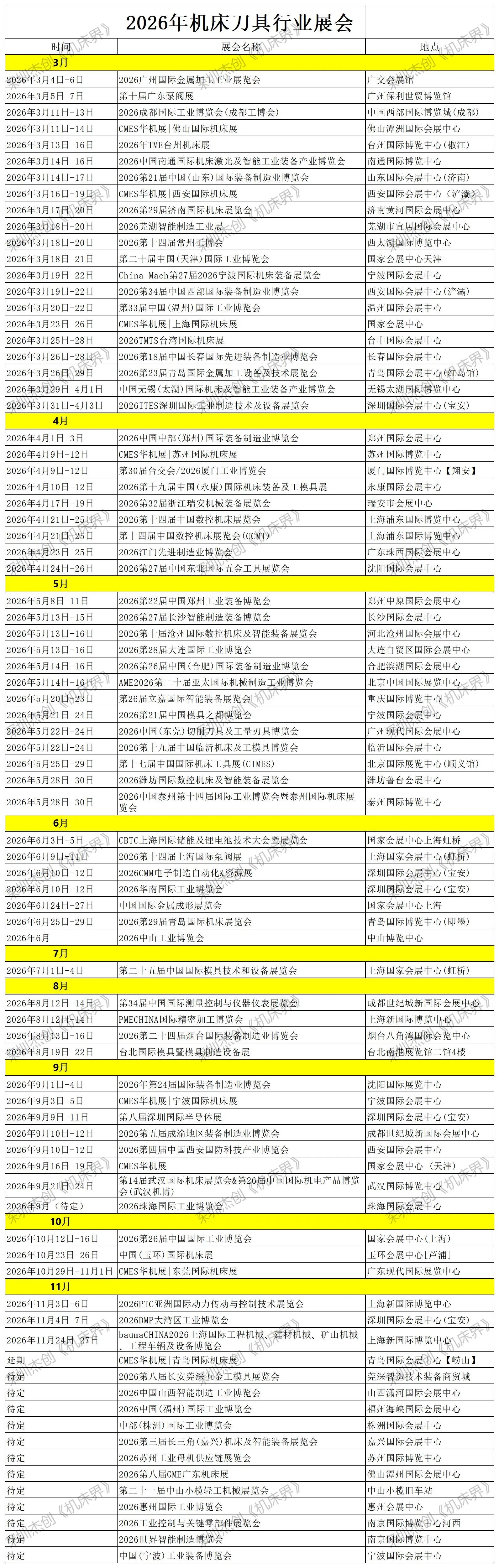 机床人注意!2026全年行业展会精华表,小编熬3天整理完了!