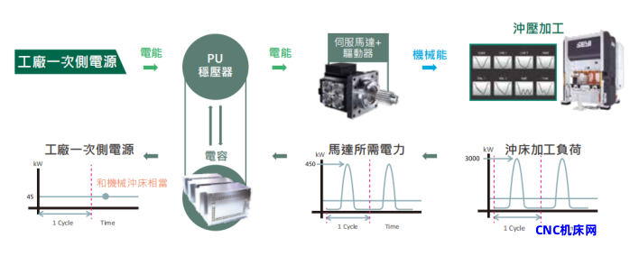 协易伺服冲床在节能方面表现卓越,主要得益于两项关键技术:电力平准化和马达回生发电。冲压加工时的瞬间电流通过稳压器让工厂一次侧电流保持稳定,避免了传统冲床对电网的冲击。同时,在马达减速时,系统会将产生的电能通过电容储存,实现能源回收再利用,大幅降低了能源浪费。