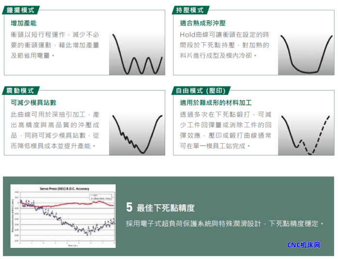 持压模式:让冲头在设定的时间段于下死点持压,适合对加热料片进行成形及模内冷却。