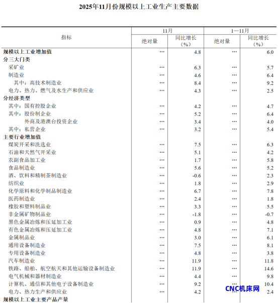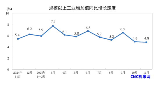 11月份,规模以上工业增加值同比实际增长4.8%(增加值增速均为扣除价格因素的实际增长率)。从环比看,11月份,规模以上工业增加值比上月增长0.44%。1—11月份,规模以上工业增加值同比增长6.0%。