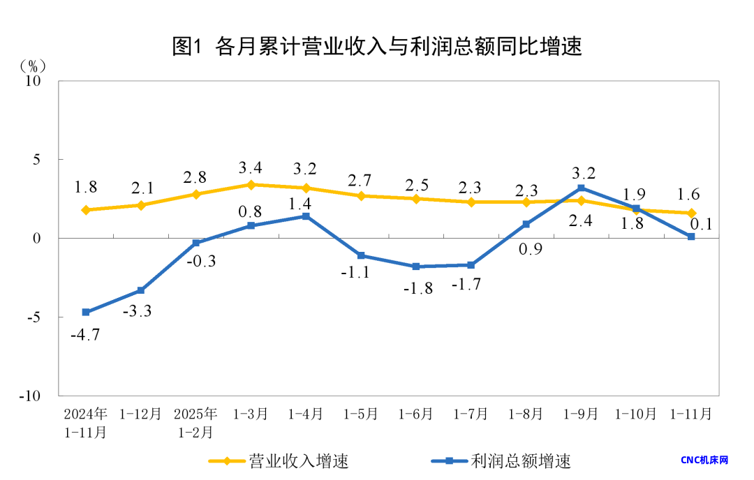 1—11月份,规模以上工业企业实现营业收入125.34万亿元,同比增长1.6%;发生营业成本107.17万亿元,增长1.8%;营业收入利润率为5.29%,同比下降0.08个百分点。