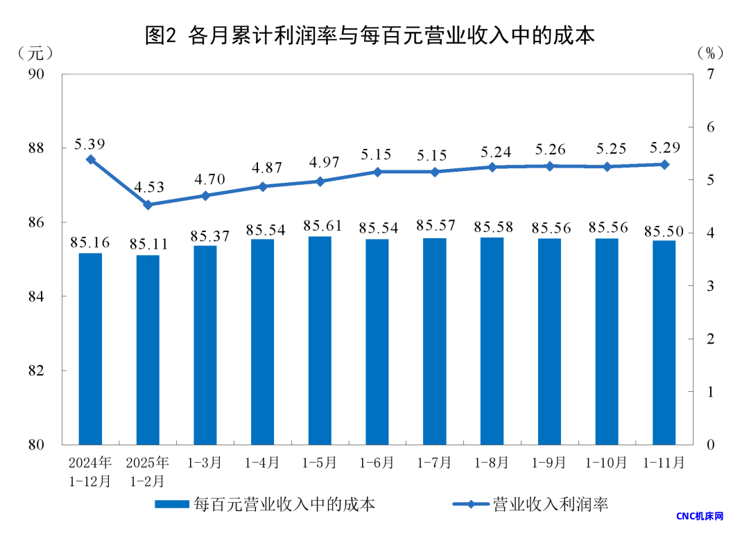 1—11月份,规模以上工业企业每百元营业收入中的成本为85.50元,同比增加0.18元;每百元营业收入中的费用为8.39元,同比减少0.06元。