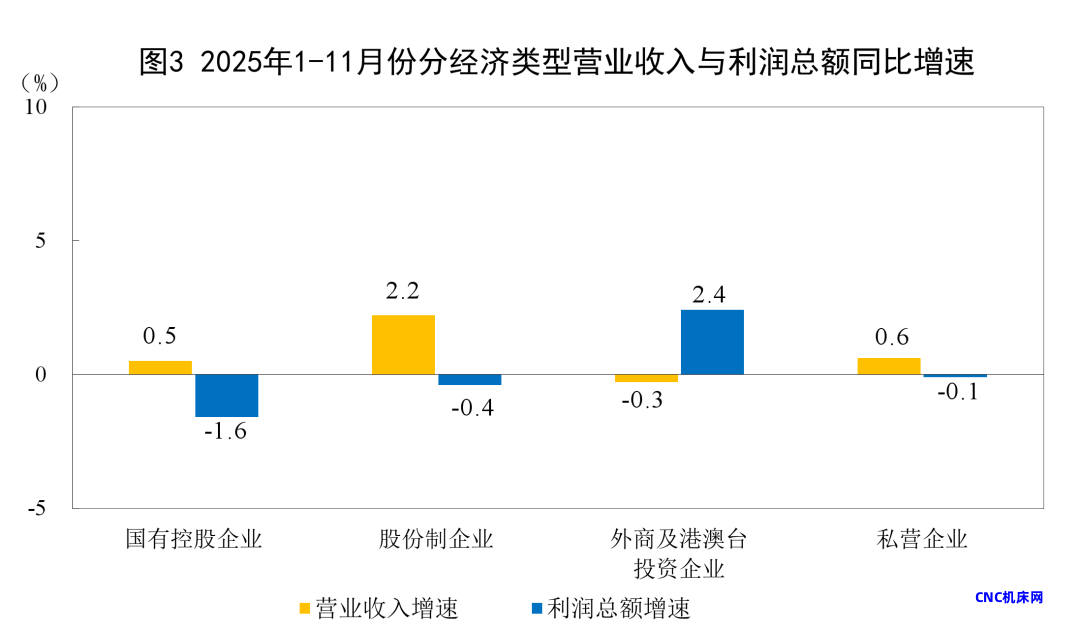 1—11月份,规模以上工业企业中,国有控股企业实现利润总额20083.6亿元,同比下降1.6%;股份制企业实现利润总额49565.6亿元,下降0.4%;外商及港澳台投资企业实现利润总额16355.3亿元,增长2.4%;私营企业实现利润总额19319.9亿元,下降0.1%。
