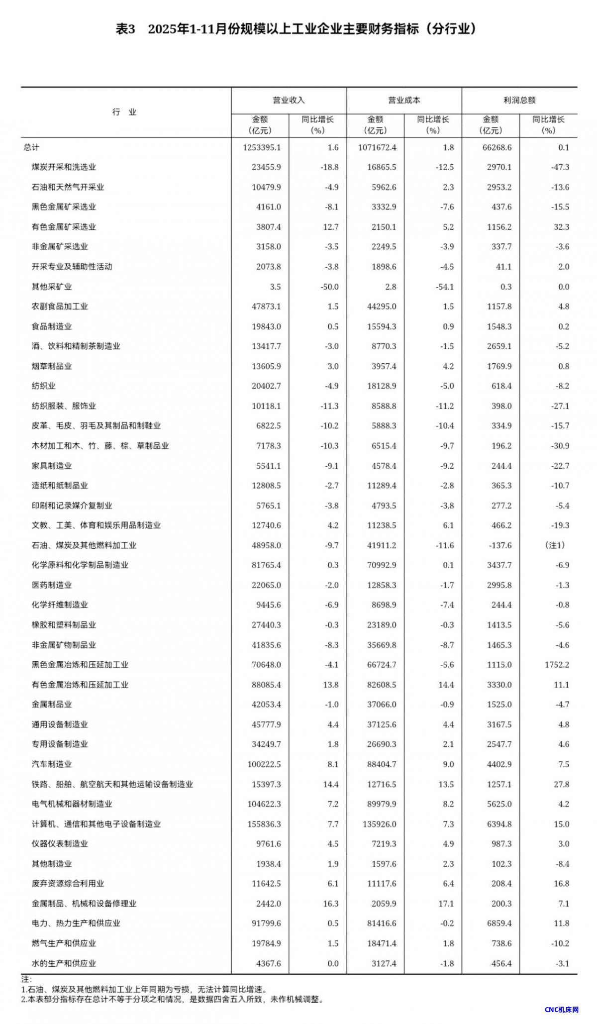 1—11月份,主要行业利润情况如下:计算机、通信和其他电子设备制造业利润同比增长15.0%,电力、热力生产和供应业增长11.8%,有色金属冶炼和压延加工业增长11.1%,汽车制造业增长7.5%,农副食品加工业增长4.8%,通用设备制造业增长4.8%,专用设备制造业增长4.6%,电气机械和器材制造业增长4.2%,石油、煤炭及其他燃料加工业同比减亏,非金属矿物制品业下降4.6%,化学原料和化学制品制造业下降6.9%,纺织业下降8.2%,石油和天然气开采业下降13.6%,煤炭开采和洗选业下降47.3%。
