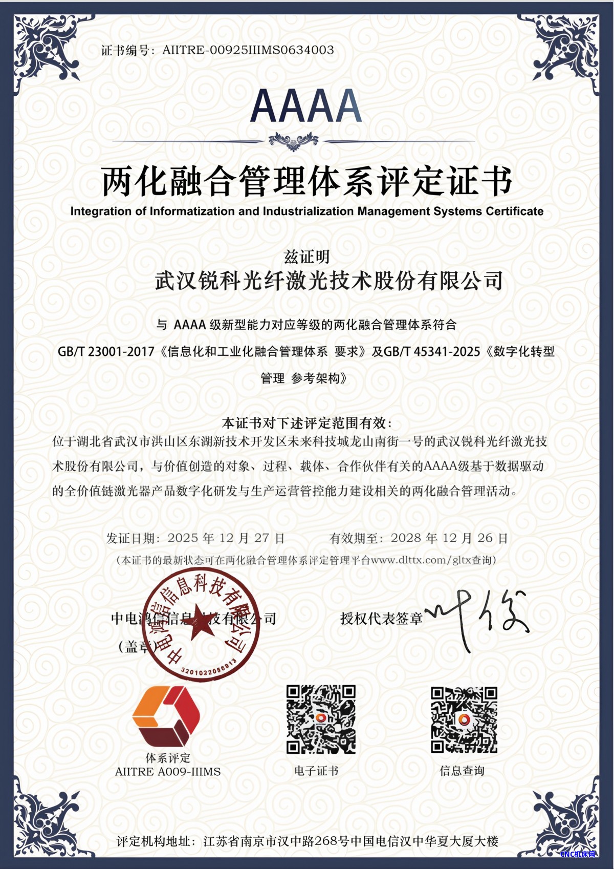 12月27日,锐科激光凭借在数字化建设领域的深耕实践,荣获“AAAA级数字化转型管理体系”和“AAAA级两化融合管理体系”两项评定证书,标志着公司在全价值链数字化建设领域的核心能力和信息化与工业化深度融合方面获得国家层面双重认可,树立了激光行业高质量发展的新标杆。