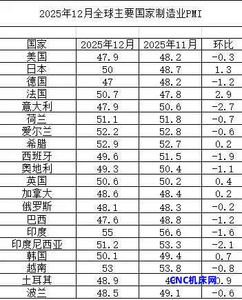 2025年12月份,欧洲制造业PMI为49.3%,较上月下降0.3个百分点,连续6个月保持在49%及以上的水平。从主要国家来看,英国、法国和希腊制造业PMI较上月上升,且在50%以上的扩张区间;德国和意大利制造业PMI较上月有不同程度下降,且均降至48%以下。