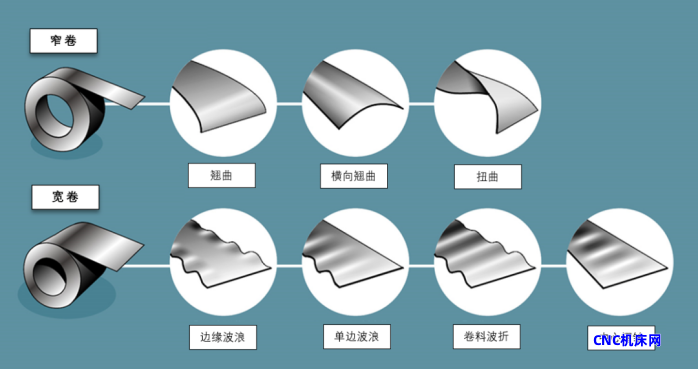 宽卷也会出现一些其他的平整度缺陷,常见的有:波折(横跨整个卷材的波形弯曲)、边缘波浪、单边波浪和中心褶皱。
