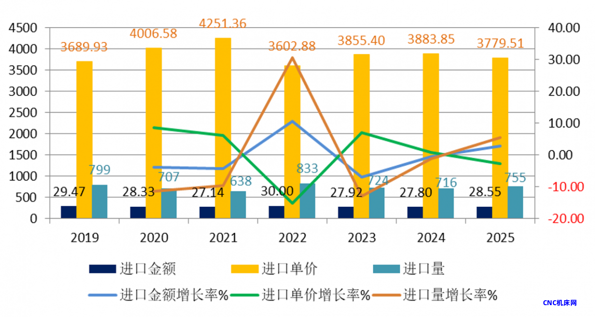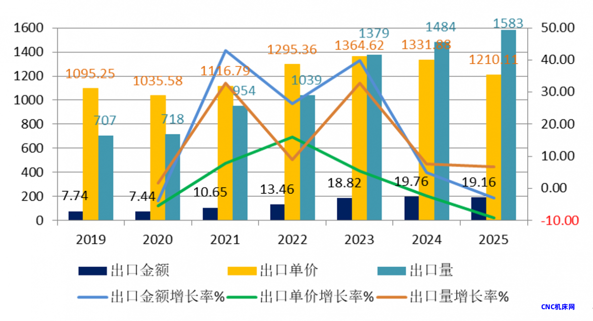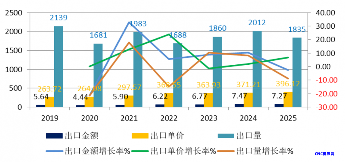 2019年至2025年,出口产品金额累积增长28.9%,出口产品量累积下滑14.2%;进口产品金额累积下降36.1%,进口产品量累积下降10.2%;出口单价稳步增长,累积增长50.2%;进口单价持续下滑,累积下滑28.8%。