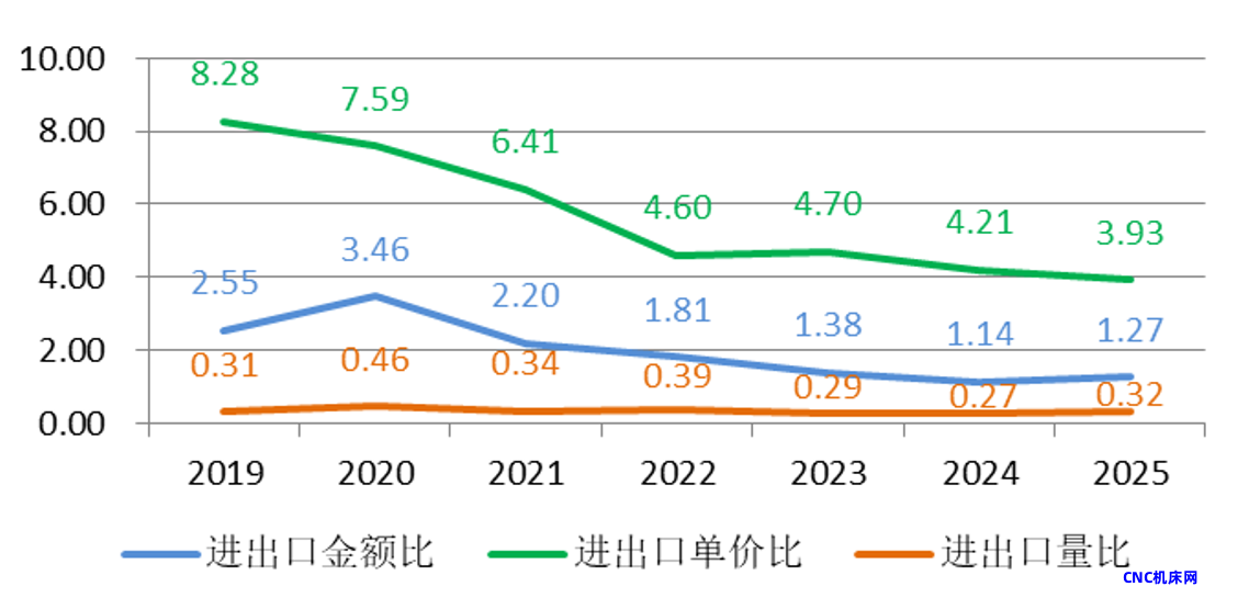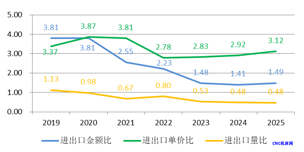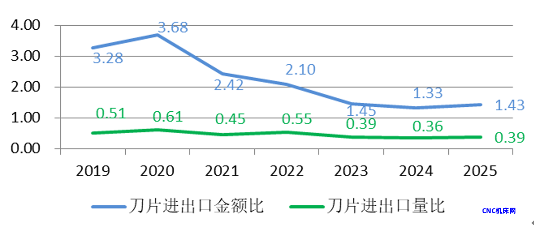 2019年至2025年,刀片进出口量比为0.36-0.61,即刀片进口量是出口量的一半左右。
