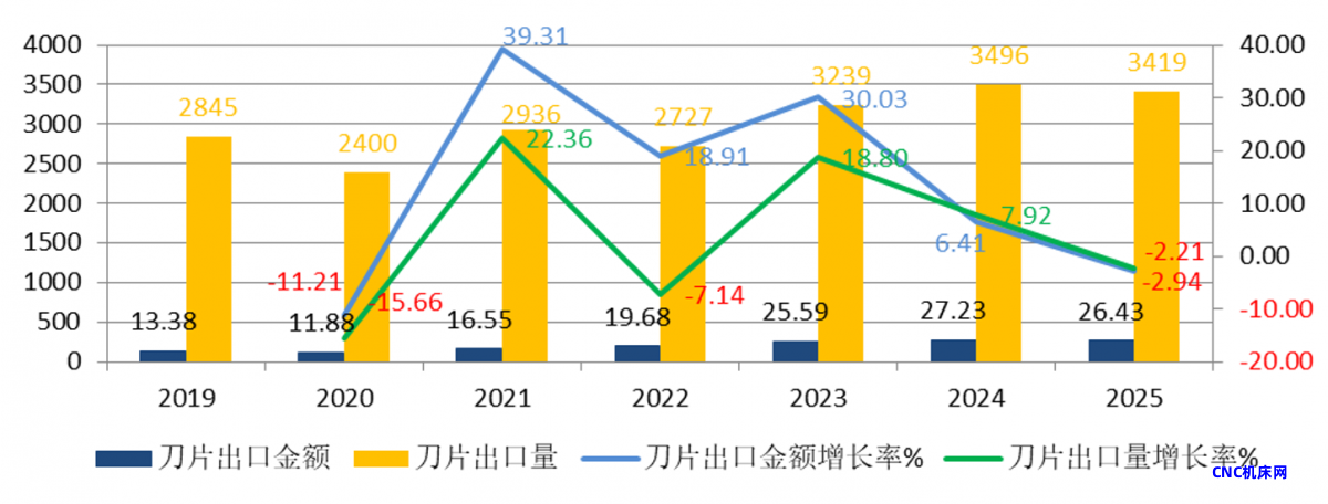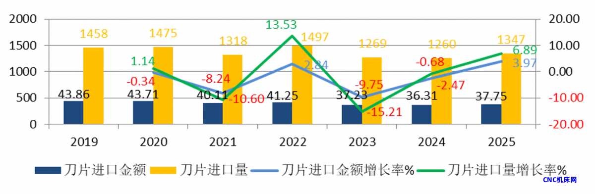中国机床工具工业协会工具分会秘书处收集和整理了2019-2025年“经镀或涂层的硬质合金制的金工机械用刀及片(商品编码82081011)”(以下简称涂层刀片)和“其他硬质合金制的金工机械用刀及片(商品编码82081019)”(以下简称非涂层刀片)的进出口海关数据,并进行了计算和分析,供行业参考。
