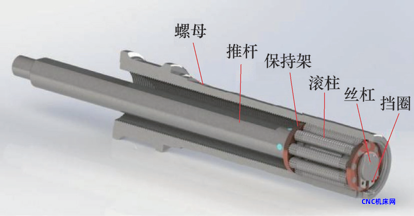 相较于传统反向式行星滚柱丝杠副齿轮的加工难度高、精度保持性差以及运行过程中摩擦磨损严重的问题,逐渐出现了新结构。江苏润孚动力[8]取消了丝杆齿轮/环槽及滚柱齿轮/环槽结构,设计笼形保持架,彻底消除复合结构加工瓶颈,在保障滚柱轴向平行度与恒导程特性的同时,显著降低振动噪声,实现高精度、规模化量产。无齿反式行星滚柱丝杠副如图3所示。