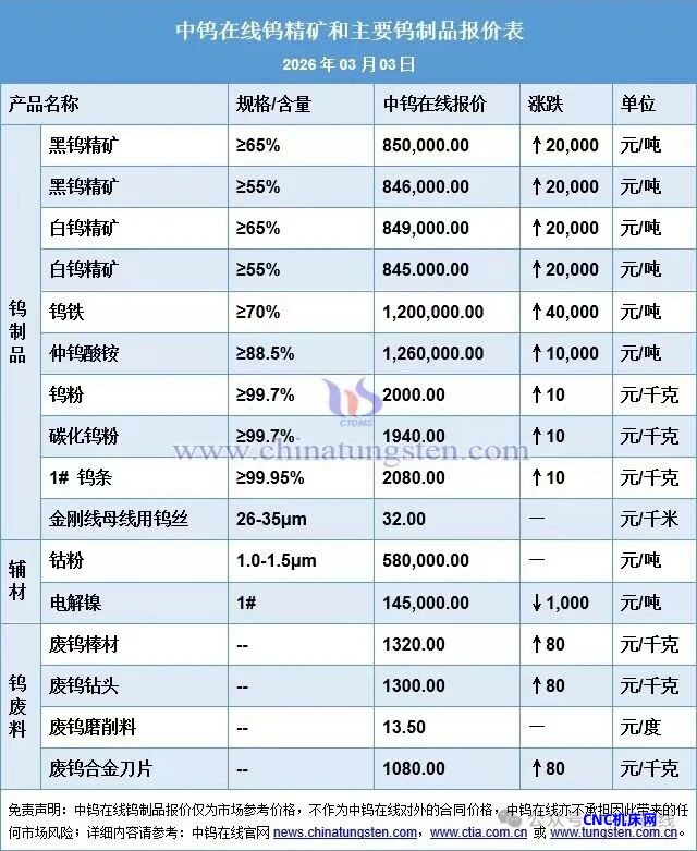 国际市场上,韩国SK Specialty、Foosung两大六氟化钨制造商2026年起上调产品价格 70%~90%,供应三星电子、SK 海力士等半导体企业;肯纳金属对欧洲区硬质合金刀具提价;日本三菱综合材料宣布4月1日起上调亚洲区数控刀具价格10%~15%,均直指钨原料成本飙升的压力。