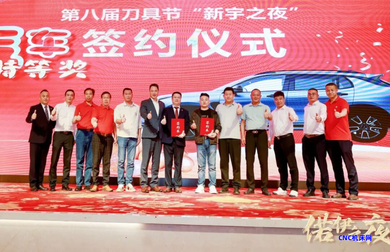 祝酒仪式后,大会进入荣誉盛典环节,举行年度推广大使表彰仪式。在第八届刀具节冠名单位——济南新宇硬质合金股份有限公司总经理陆义华、刀具节职能组组长以及全体嘉宾的共同见证下,东莞刀协会长王柏强与汽车大奖赞助单位——常州市同创智能精密机械有限公司总经理黄军,共同完成“新宇之夜”12万元汽车大奖签约仪式,将现场氛围推向高潮,充分展现了东莞刀协强劲的凝聚力与发展活力。