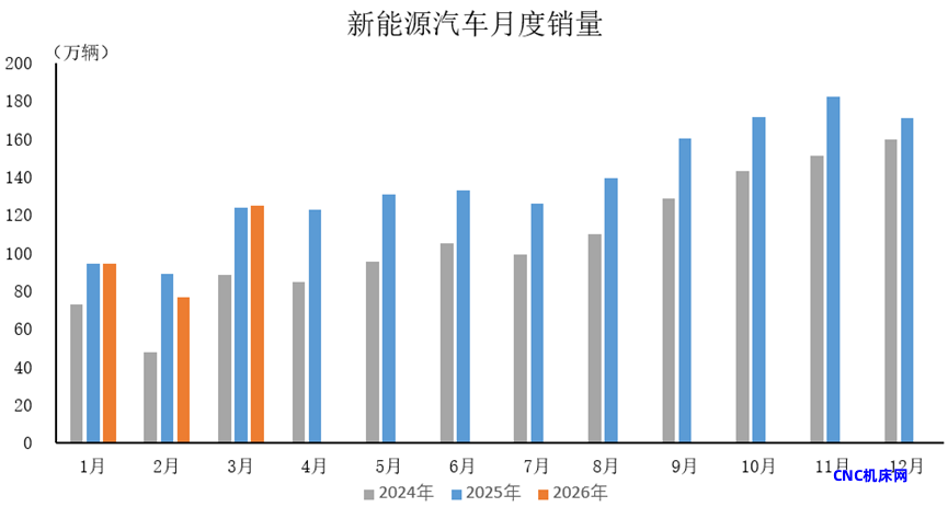 2026年3月,新能源汽车产销分别完成123.1万辆和125.2万辆,产量同比下降3.6%,销量同比增长1.2%。