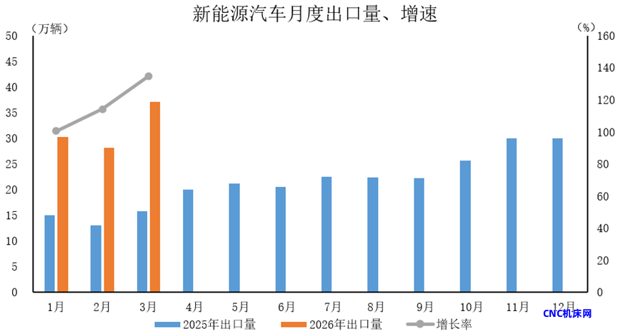2026年3月,新能源汽车出口37.1万辆,环比增长31.6%,同比增长1.3倍。
