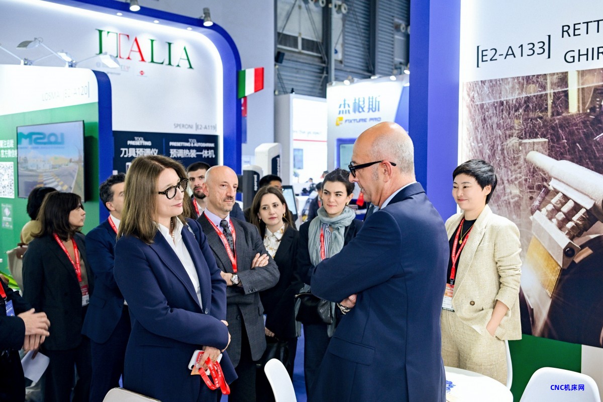 展会期间,意大利驻沪总领事安缇雅女士(Ms. Tiziana D’Angelo)莅临意大利国家展团,与意大利对外贸易委员会(ITA)上海代表处首席代表戴志龙先生 (Mr. Fabio De Cillis)以及意大利机床机器人及自动化制造商协会(UCIMU)国际关系部代表Claudia Tovaglieri女士一同参观了展区,并与多家参展企业现场交流。此外,ITA在展台设立了信息咨询台,为参观者提供与意大利展团合作等方面的答疑。