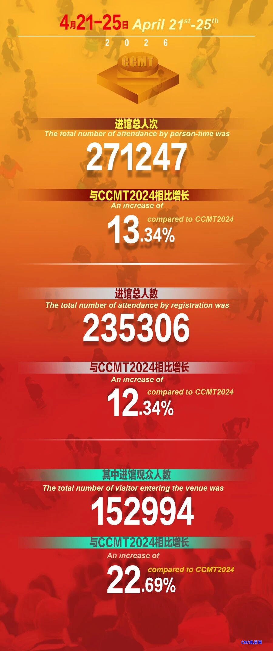 According to the data of access control system of Shanghai New International Expo Centre (SNIEC), from April 21st-25th, 2026, the total number of attendance by person-time was 271,247, an increase of 13.34% compared to CCMT2024; The total number of attendance by registration was 235,306, an increase of 12.34% compared to CCMT2024;Among them, the total number of visitor entering the venue was 152,994, an increase of 22.69% compared to CCMT2024.