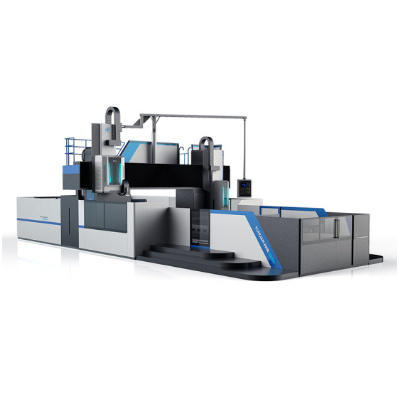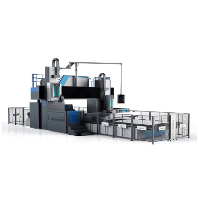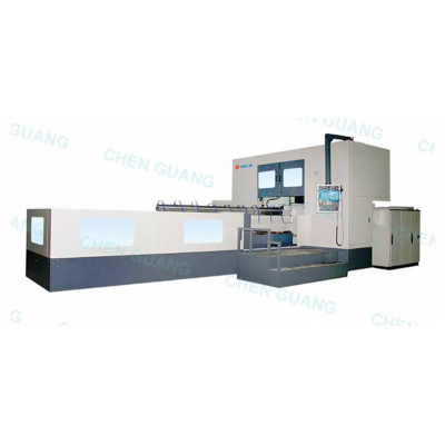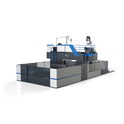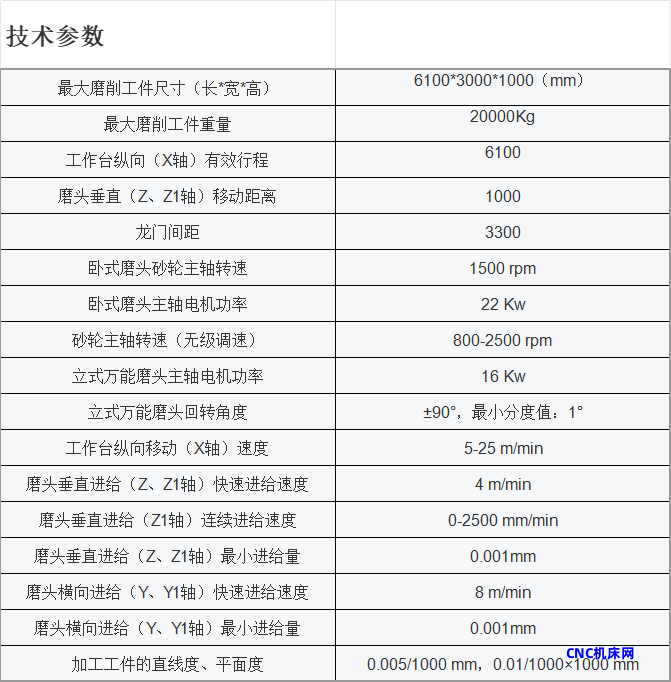 双立柱、阶梯横梁组成高刚性龙门框架结构,床身采用一平一V型静压导轨,工作台由两个单作用油缸控制沿床身导轨纵向运动,采用独立液压站,无级调速低摩擦噪音小运动平稳;配置一组卧式磨头和立式万能磨头,磨头横向及垂直向移动采用伺服电机驱动丝杠,垂直方向采用光栅尺定位,实现横向定距磨削、间歇进给、微量进给、无级调速等功能。