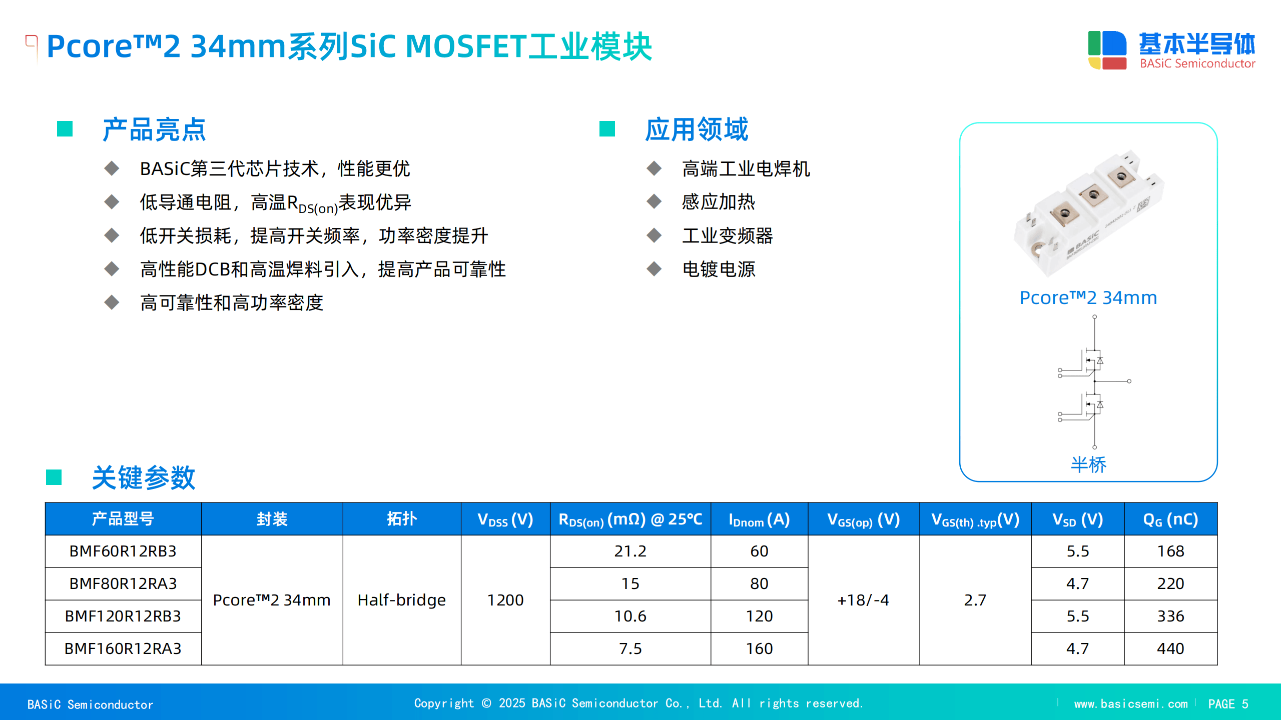 基本半导体推出的34mm SiC MOSFET模块系列,作为其核心工业模块产品线,以其独特的封装和卓越的性能脱颖而出 。该系列均采用标准34mm半桥拓扑封装,提供了覆盖60A至160A连续电流等级的丰富型号,包括BMF60R12RB3、BMF80R12RA3、BMF120R12RB3和BMF160R12RA3 。