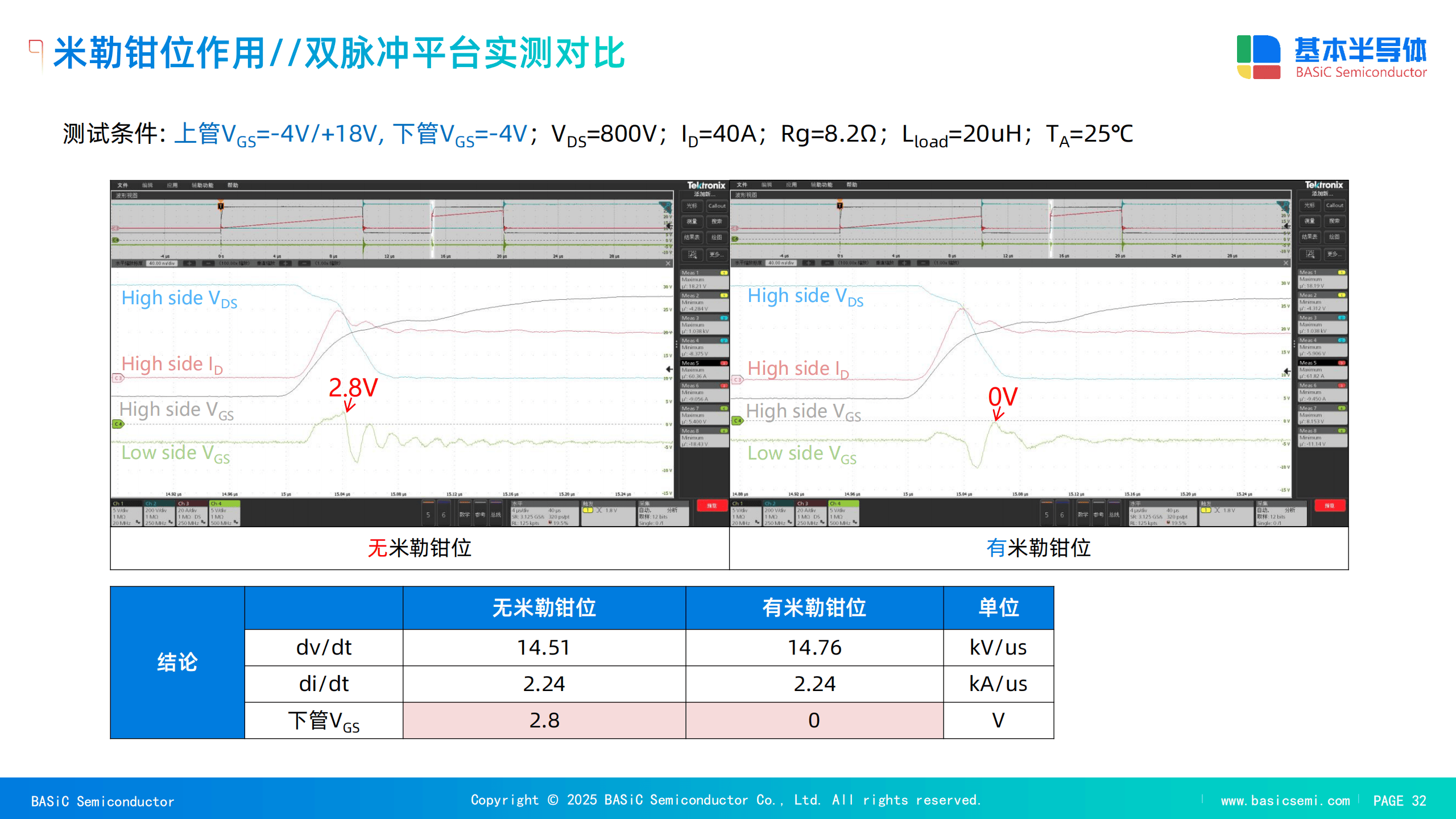 为了解决这一问题,基本半导体在其驱动方案中集成了米勒钳位(Miller Clamp)功能。基本半导体的产品手册详细展示了米勒钳位功能的工作原理和实测效果 。通过双脉冲测试,实测波形对比显示,在没有米勒钳位功能的情况下,下管的门极电压被高dv/dt抬高至7.3V,远超其2.7V的阈值电压,存在严重的误导通风险 。而当启用米勒钳位功能后,该电压被有效钳制在2V以下,成功抑制了误导通现象 。