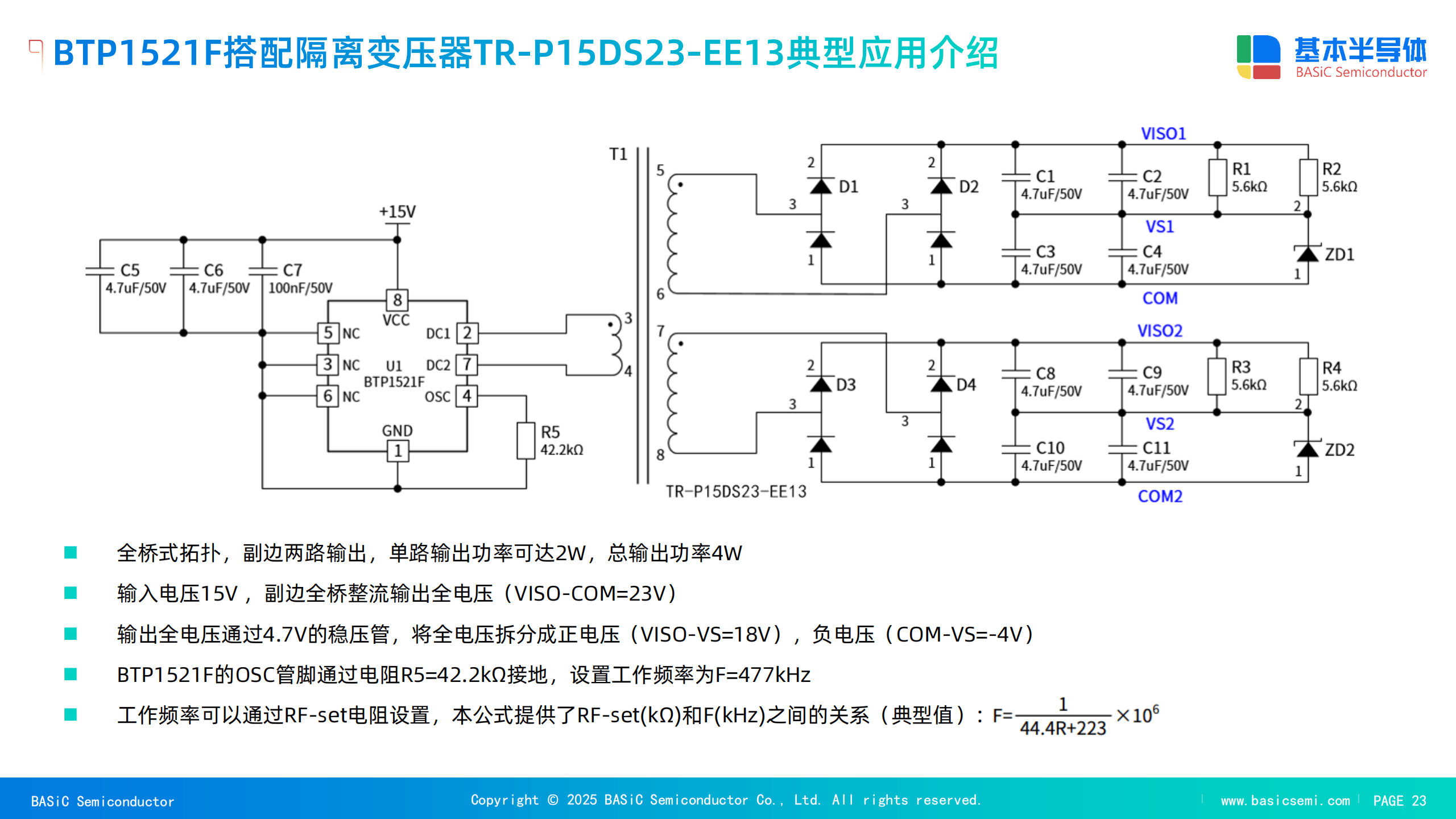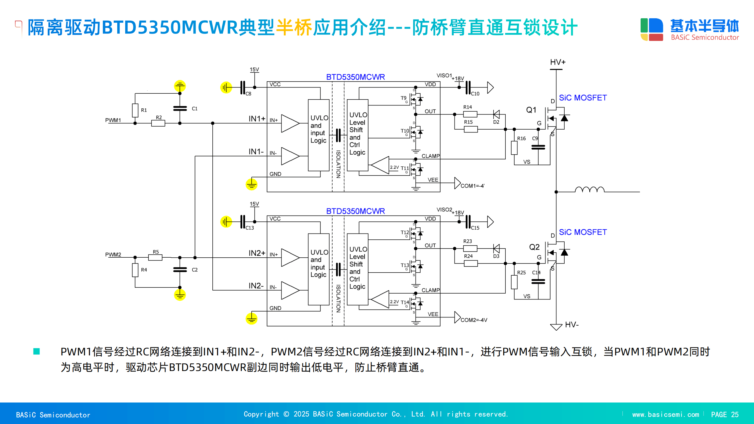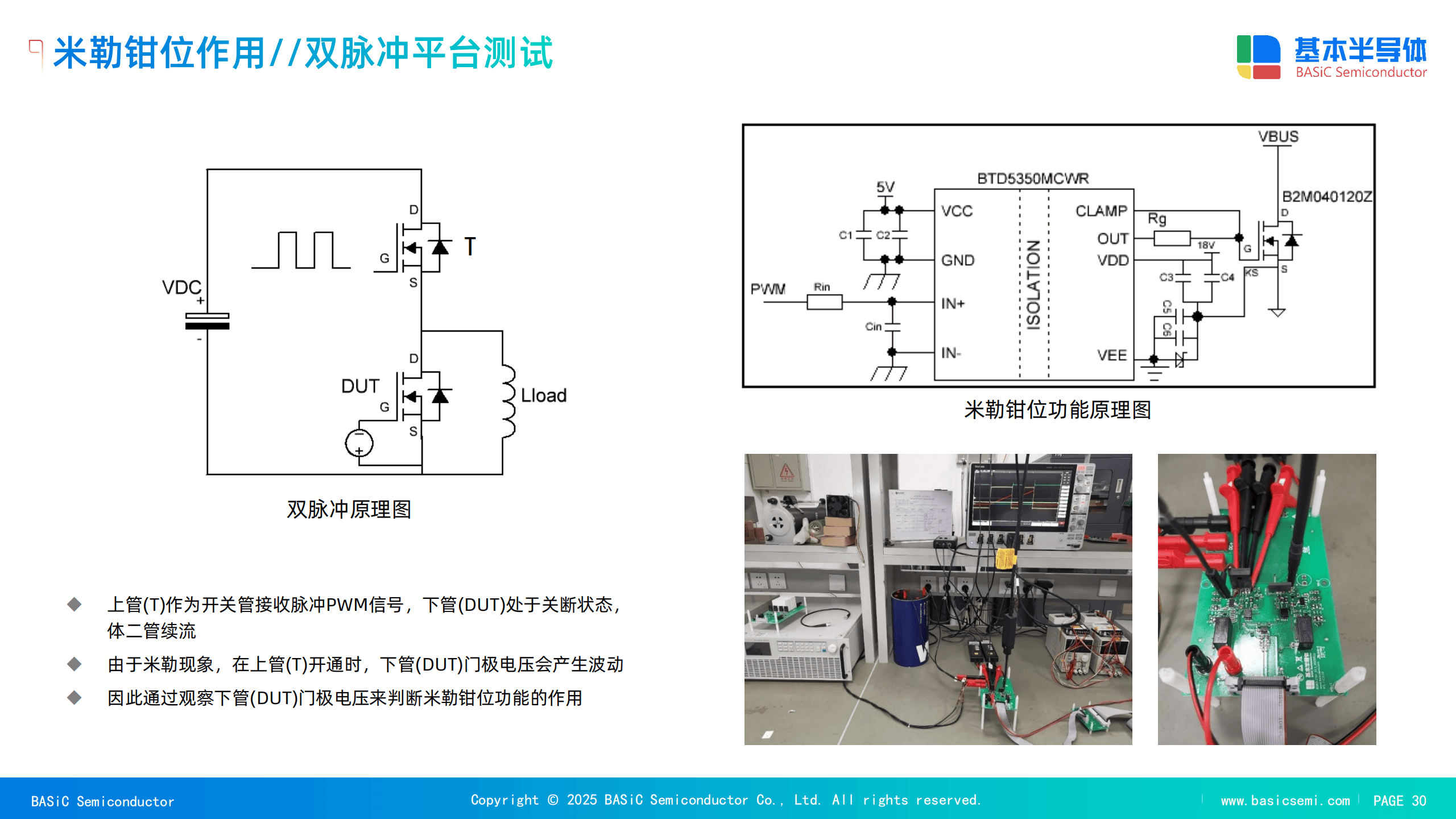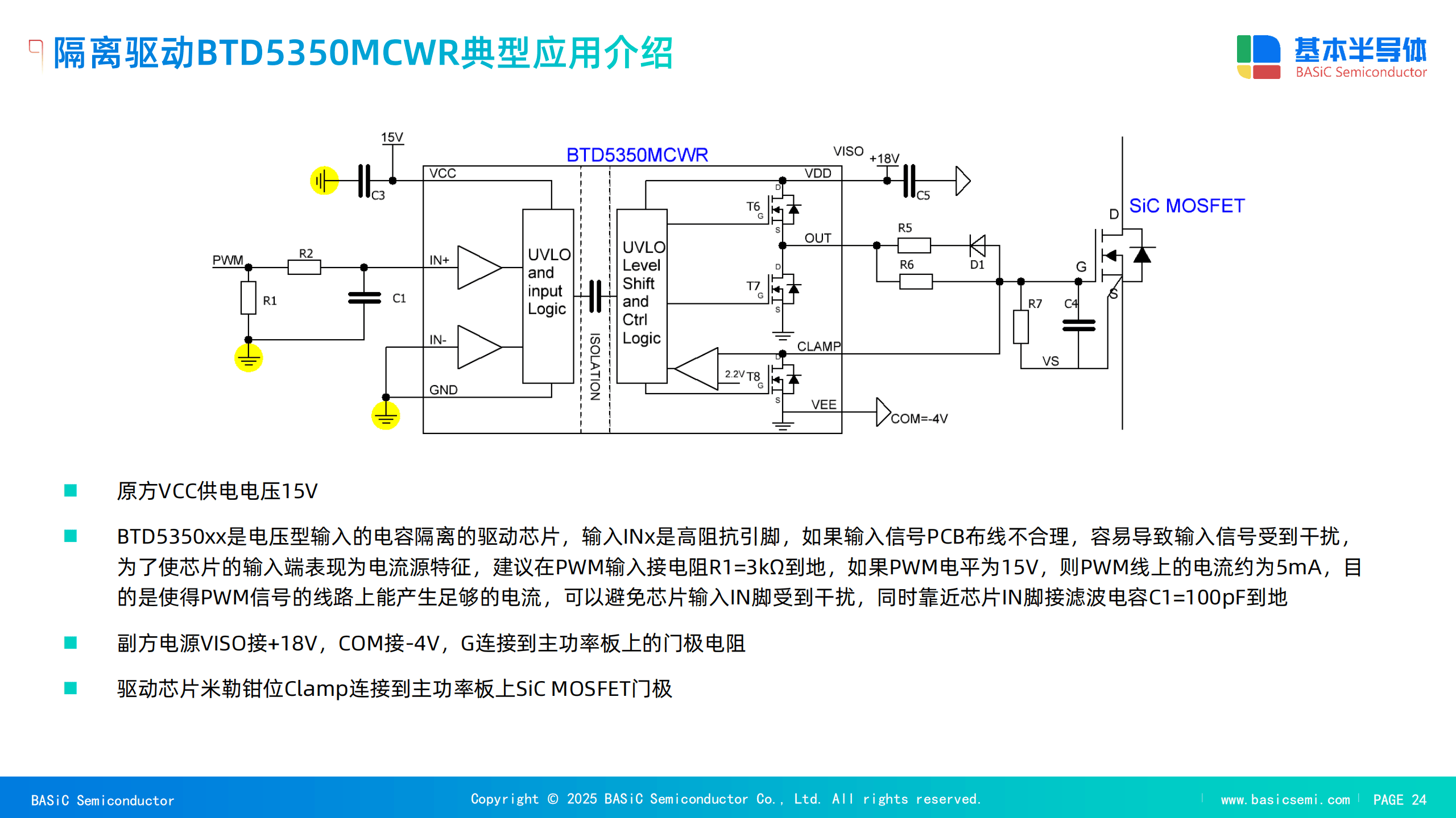 米勒钳位的工作原理是在SiC MOSFET关断期间,当其门极电压降至特定阈值(例如BTD5452R芯片的1.8V)时,驱动芯片内部的钳位开关会被激活 。这个开关会在门极和负电源轨之间形成一个极低阻抗的通路,迅速泄放米勒电流,有效防止门极电压被抬高,从而确保器件可靠关断。这表明,米勒钳位是驱动SiC MOSFET在高频、硬开关应用中不可或缺的保护机制。