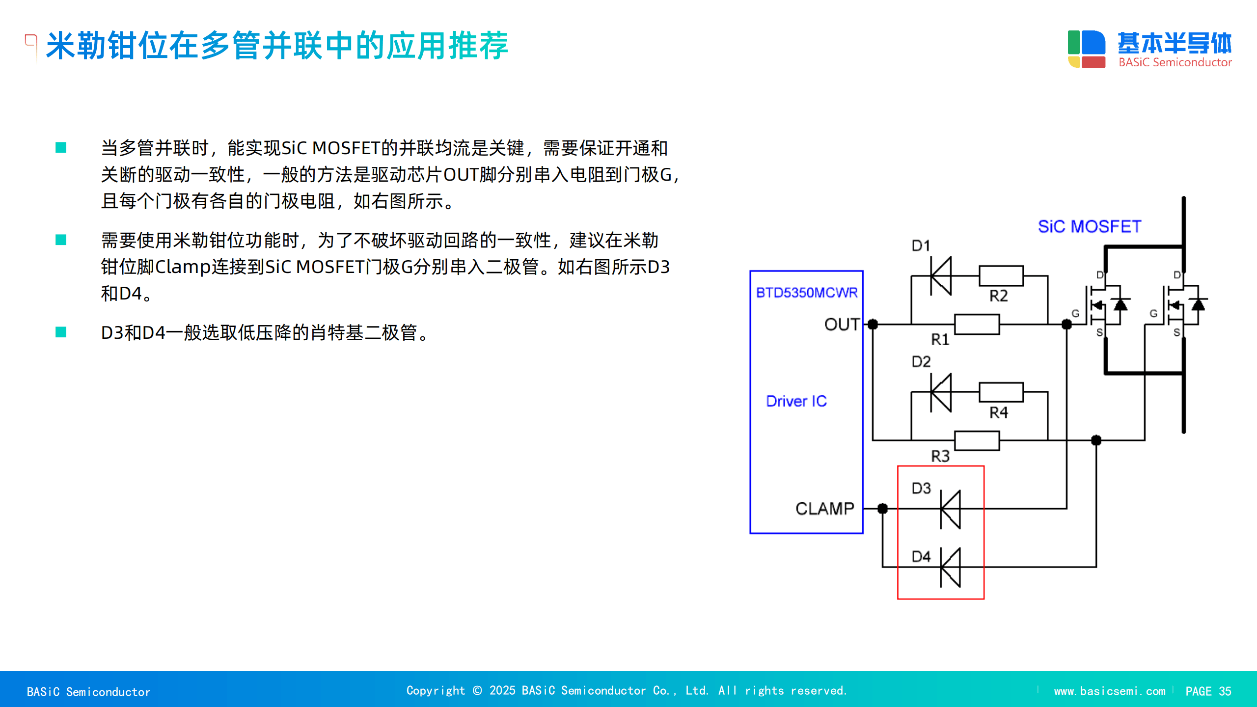 米勒钳位功能的应用: 当并联模块需要使用米勒钳位功能时,为了不破坏驱动回路的一致性,推荐在驱动芯片的米勒钳位脚(Clamp)与每个SiC MOSFET的门极之间分别串联一个肖特基二极管 。这些二极管应选择低压降型号,以确保米勒钳位通路的一致性,从而实现动态均流。
