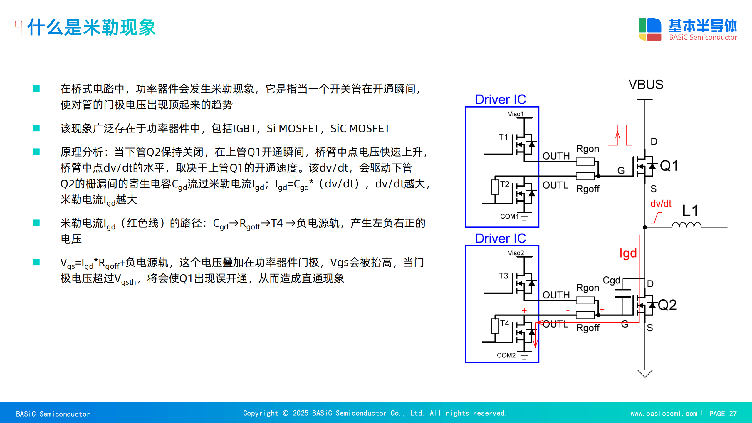 尽管SiC MOSFET性能优越,但其高开关速度也带来了驱动上的特殊挑战,其中最突出的问题是米勒效应(Miller Effect)导致的误导通风险。在半桥或全桥电路中,当一个开关管(如上管)开通时,桥臂中点的电压会迅速上升。这种高dv/dt会通过关断管(如下管)的栅极-漏极寄生电容(Cgd)产生一个米勒电流(Igd=Cgd×dv/dt) 。这个米勒电流流经门极关断电阻(RGoff),会在下管的栅极-源极之间产生一个正向电压(Vgs=Igd×RGoff)。如果这个电压超过了SiC MOSFET较低的阈值电压(Vgsth),就会导致本应保持关断的下管意外导通,造成桥臂短路(也称为“直通”),进而损坏器件 。