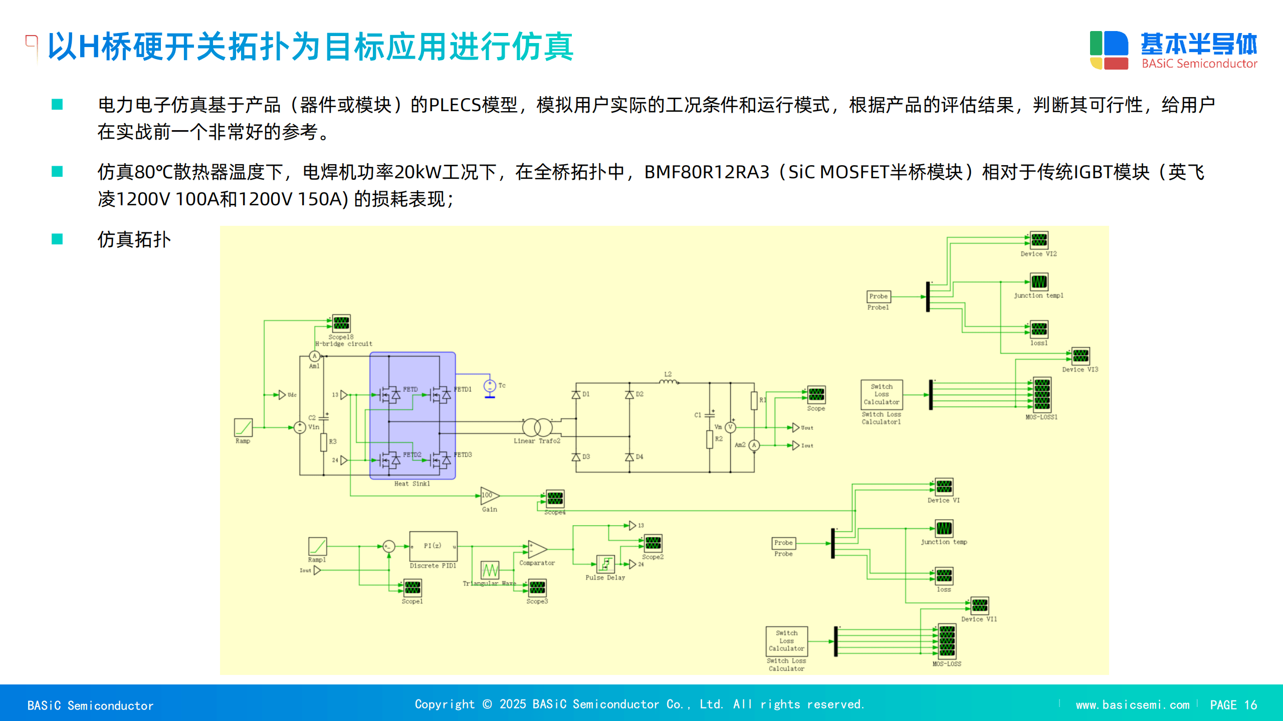 基本半导体通过电力电子仿真,模拟了BMF80R12RA3模块在实际工况中的性能表现,并与传统IGBT模块进行了对比 。仿真条件设定为:全桥拓扑、电焊机功率20kW、散热器温度
