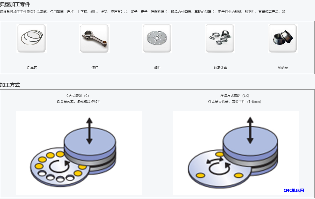 该磨床主轴为立式结构,送料采用转盘式送料方式,数控系统驱动运转。可同时加工零件上下两个平行的端面,实现粗、精磨削一次完成,能够磨削各类圆形、非圆形等任意形状的零件。数控双端面磨床加工精度高、表面光洁度好,适合高精密端面零件的批量加工。 主要针对活塞环、气门垫圈、连杆、十字轴、阀片、拨叉、液压泵叶片、转子、定子、压缩机滑片、轴承内外套圈、车辆的刹车片、电子行业的磁环、磁钢片、石墨板、摆线齿轮等产品双面磨削。