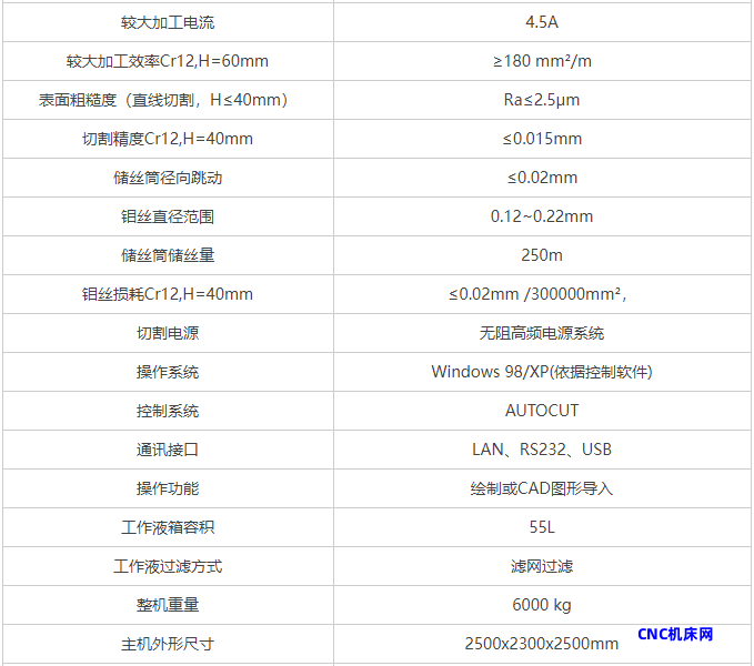 DK77100 大尺寸高效率快走丝线切割是集机床电器,高频电源,伺服控制与图形编程为一体,实现了高效率,高精度,高光洁度,简便的加工控制,大幅提高快走丝机床的加工水平。机床换向采用变频器柔性换向,可以任意调节运丝滚筒速度,从而提高工件光洁度。,高效(切割效率可达每小时7000到8000平方毫米) 是普通机床切割效率的2倍,节能(机床每小时能耗0.85度电)相对普通机床节能50%,环保(机床环保水罩防止工作液外溅,采用高压过滤水箱工作液可以30个工作日更换一次,大大提高工作时间,及降低排污次数。机床电器部分全部安装在控制柜内防水处理,供油全部用手动压油泵集成供油。