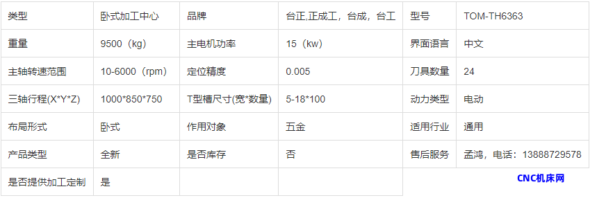 线性导轨系列卧式加工中心光机是指:X、Y、Z向导轨均为线性导轨,不包含任何电机、电器、电箱、控制系统、冷却装置以及机床外罩板金,按国家相关标准装配、检验、油漆完工的卧式数控铣床光机。本系列按是否配置伺服旋转工作台分为两类,带伺服旋转工作台的系列有:TOM-TH50 、TOM-TH50B、TOM-TH63 、TOM-TH63B、 TOM-TH80;不带伺服旋转工作台的系列有: TOM-TH1085(后缀无字母为不配工作台)、TOM-TH1085A。主要配置有: