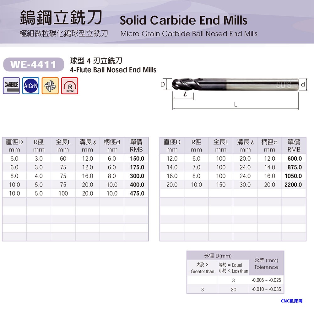 本网页所展示的有关【钨钢立铣刀—极细微粒碳化钨球型立铣刀】的信息/图片/参数等由的会员【】提供,由CNC机床网会员【】自行对信息/图片/参数等的真实性、准确性和合法性负责,本平台(本网站)仅提供展示服务,请谨慎交易,因交易而产生的法律关系及法律纠纷由您自行协商解决,本平台(本网站)对此不承担任何责任。您在本网页可以浏览【钨钢立铣刀—极细微粒碳化钨球型立铣刀】有关的信息/图片/价格等及提供 【钨钢立铣刀—极细微粒碳化钨球型立铣刀】的商家公司简介、联系方式等信息。