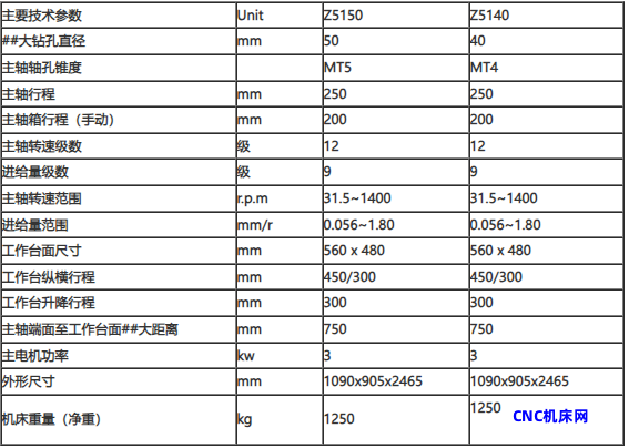 1.z5140系列方柱立式钻床是###型通用机床。机床的##大钻孔直径为¢40m(在50-60kgf/mm的钢材上,在布氏硬度HB=200的铸铁上钻孔能力为¢40mm)2.z5140B为固定工作台;Z5140B-1为十字工作台。3.本机床除用于钻孔外,还可以扩孔、钻沉头孔、锪端面、铰孔、攻丝等。4.本机床效率高、刚性好、精度高、噪音低、变速范围广。如工作台为十字工作台的,则工作台能纵横、升降手动进给。5.操纵集中,外形新颖,使用维修方便,适用于修理工具等单件小批生产的车间,若配以钻夹具,也适用于成批生产的车间。