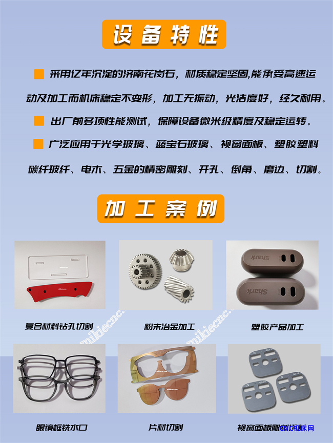 应用范围:广泛应用于亚克力、石墨、玻璃、塑胶、塑料、复合材料玻纤碳纤、五金金属、pc、pvc、pet视窗镜片等材质。雕铣、精密雕刻、精密切割、磨边、倒角、倒边、钻孔、开槽、铣牙等精密加工。