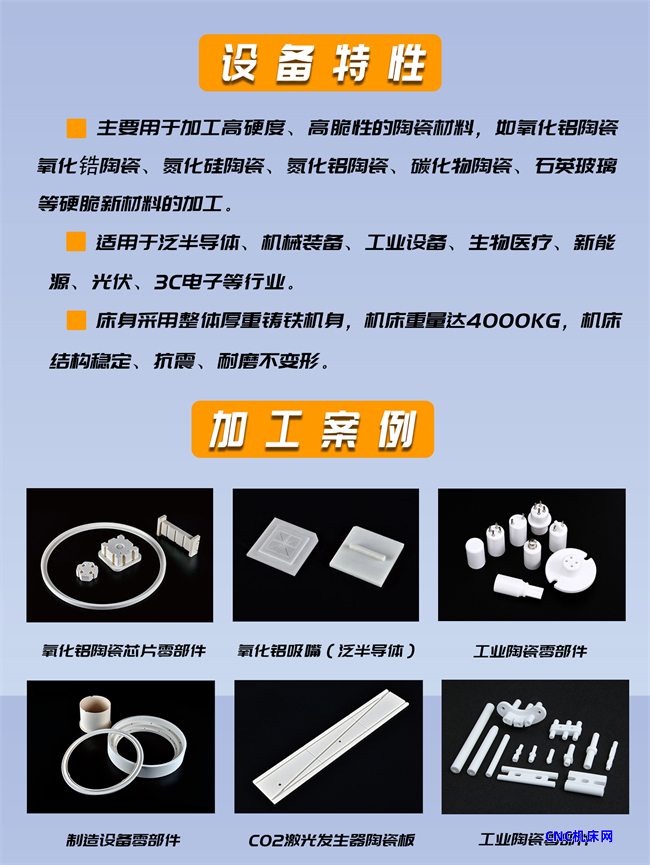 | 产品名称:铸铁陶瓷精雕机 产品型号:650ZT 应用范围:主要用于加工高硬度、高脆性的陶瓷材料,如氧化铝陶瓷、氧化锆陶瓷、氮化硅陶瓷、氮化铝陶瓷、碳化硅陶瓷、及石英玻璃等硬脆新材料或复合材料的加工。适用于泛半导体、光伏、生物医疗、新能源、3C电子等行业。 |