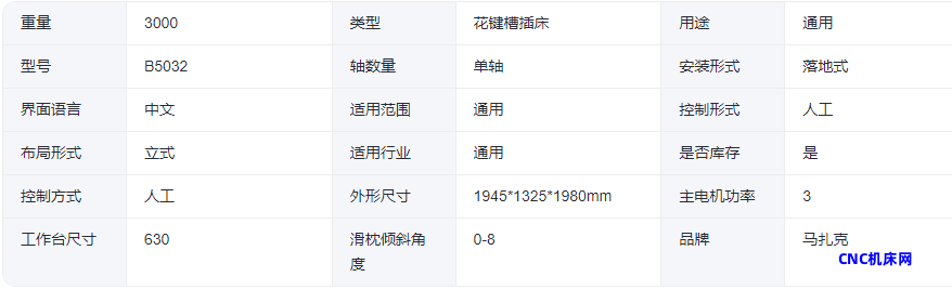 本网页所展示的有关【马扎克数控 B5032花键槽插床 运转平稳 快速走刀 精度高】的信息/图片/参数等由的会员【】提供,由CNC机床网会员【】自行对信息/图片/参数等的真实性、准确性和合法性负责,本平台(本网站)仅提供展示服务,请谨慎交易,因交易而产生的法律关系及法律纠纷由您自行协商解决,本平台(本网站)对此不承担任何责任。您在本网页可以浏览【马扎克数控 B5032花键槽插床 运转平稳 快速走刀 精度高】有关的信息/图片/价格等及提供 【马扎克数控 B5032花键槽插床 运转平稳 快速走刀 精度高】的商家公司简介、联系方式等信息。