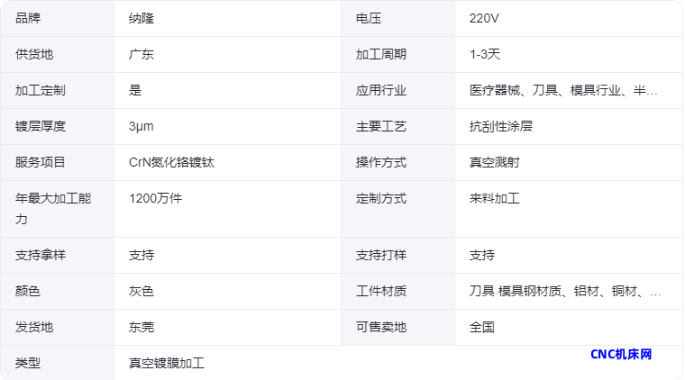 本网页所展示的有关【纳隆刀具镀抗刮性涂层加工 CrN氮化铬镀膜 耐腐蚀PVD镀层加工厂家】的信息/图片/参数等由的会员【】提供,由CNC机床网会员【】自行对信息/图片/参数等的真实性、准确性和合法性负责,本平台(本网站)仅提供展示服务,请谨慎交易,因交易而产生的法律关系及法律纠纷由您自行协商解决,本平台(本网站)对此不承担任何责任。您在本网页可以浏览【纳隆刀具镀抗刮性涂层加工 CrN氮化铬镀膜 耐腐蚀PVD镀层加工厂家】有关的信息/图片/价格等及提供 【纳隆刀具镀抗刮性涂层加工 CrN氮化铬镀膜 耐腐蚀PVD镀层加工厂家】的商家公司简介、联系方式等信息。