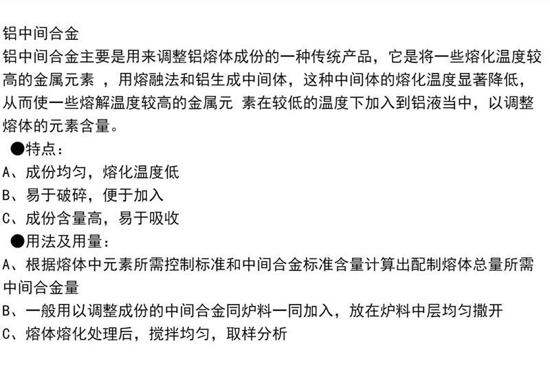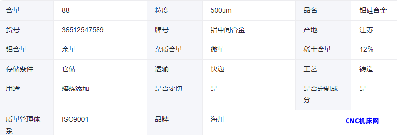 本网页所展示的有关【海川供应铝中间合金 铝硅12 AlSi20 30 50 调整合金成分】的信息/图片/参数等由的会员【】提供,由CNC机床网会员【】自行对信息/图片/参数等的真实性、准确性和合法性负责,本平台(本网站)仅提供展示服务,请谨慎交易,因交易而产生的法律关系及法律纠纷由您自行协商解决,本平台(本网站)对此不承担任何责任。您在本网页可以浏览【海川供应铝中间合金 铝硅12 AlSi20 30 50 调整合金成分】有关的信息/图片/价格等及提供 【海川供应铝中间合金 铝硅12 AlSi20 30 50 调整合金成分】的商家公司简介、联系方式等信息。